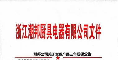近日,浙江潮邦廚具電器有限公司推出一項全新服務政策,即自2021年5月6日起,用戶在線上、線下渠道購買的潮邦集成灶將享受整機質保三年,保