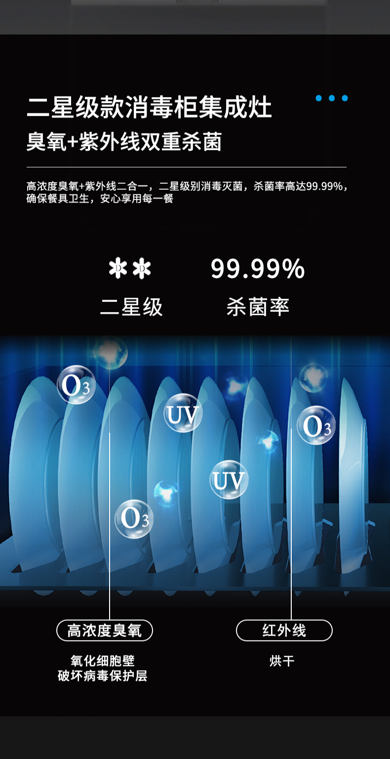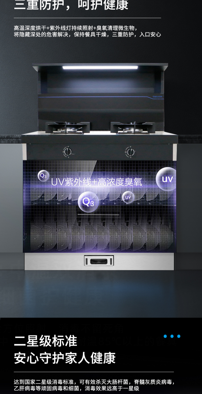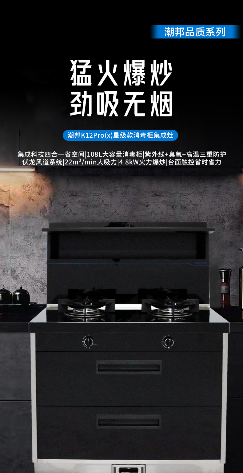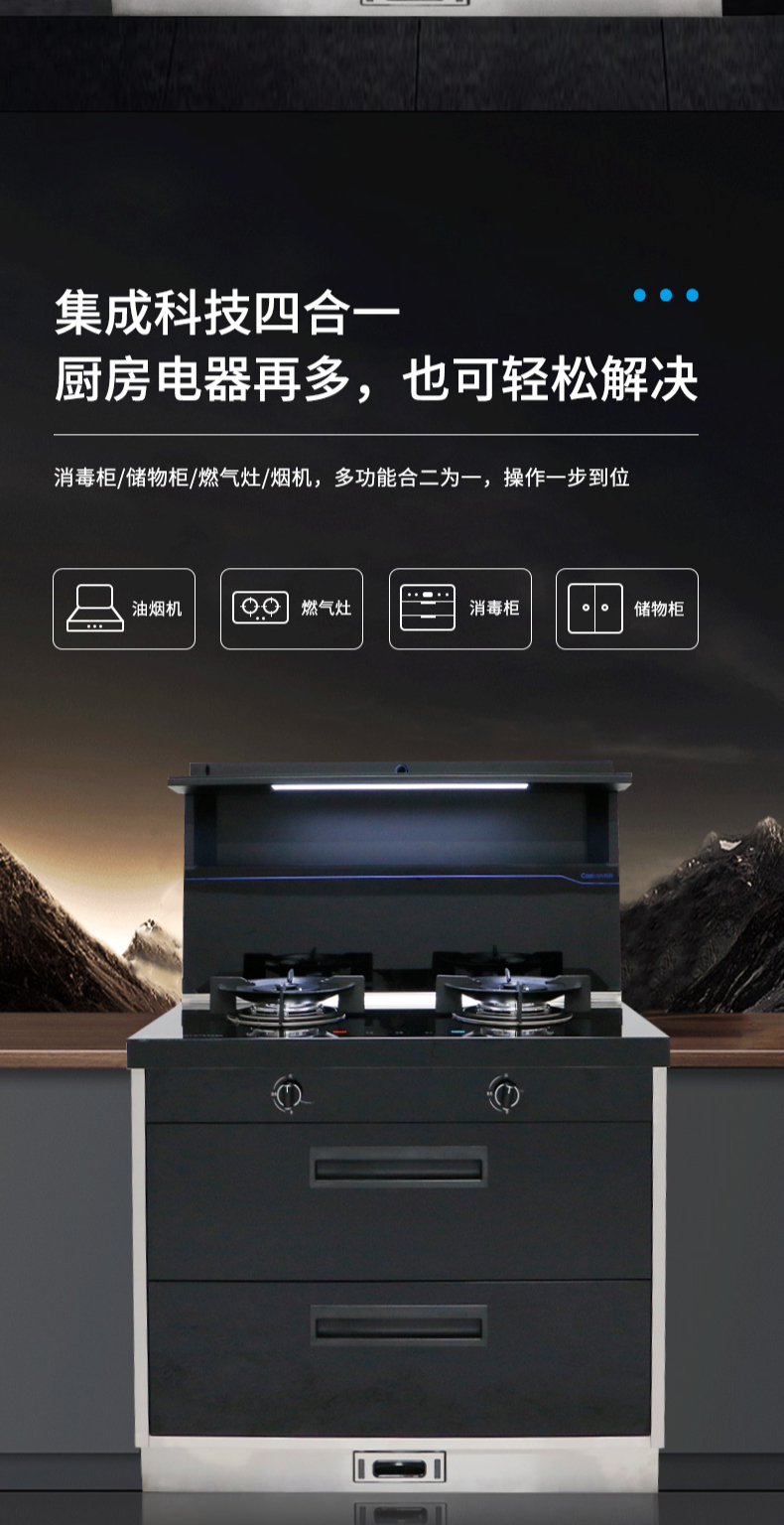 集成科技四合一省空間|108L大容量消毒柜|紫外線+臭氧+高溫三重防護(hù) 伏龍風(fēng)道系統(tǒng)|22m3大吸力|4 8kW火力爆炒|臺面觸控省時省力